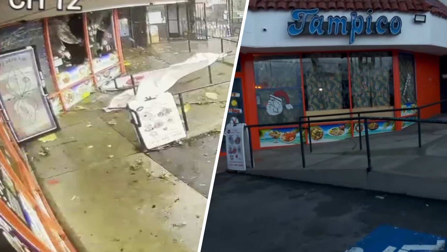 El Nuevo Mariscos Tampico took some damage when the EF0 tornado touched down in the Los Angeles neighborhood. Surveillance footage from a nearby business captured the moment debris scattered through the area due to the strong winds, forcing a sign to hit the restaurant’s front windows and break them.