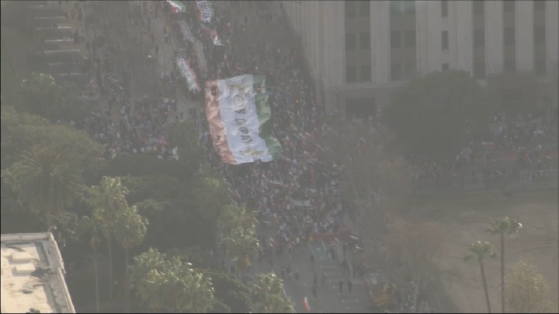 Waving flags and carrying one giant banner that read, “Help is on the way,” the demonstrators marched near Los Angeles City Hall. A small aircraft with a banner that urged the public to support Iranian protesters’ cause flew near the march.