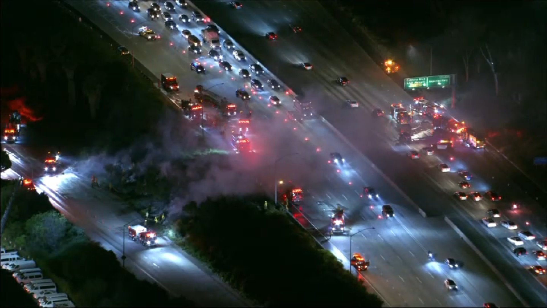 A 4‑acre grass fire broke out Thursday along the southbound 405 Freeway near the 105 interchange, backing up traffic as emergency crews worked along the roadway.