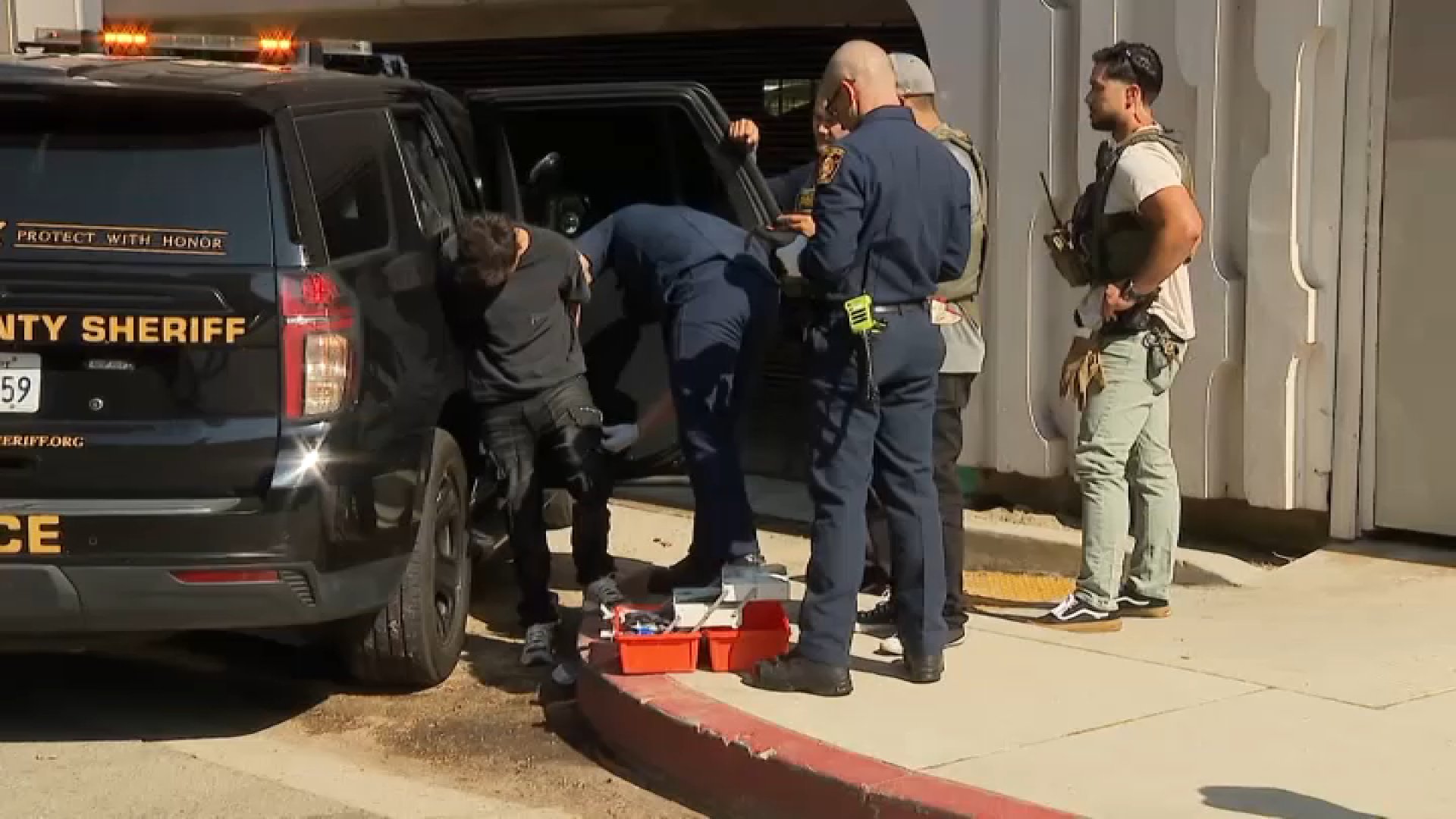 Sheriff’s deputies carried out a search warrant at the apartment building where one of the suspects lived. Neighbors tell NBCLA that the group would host loud parties, prompting visits from security more than once.